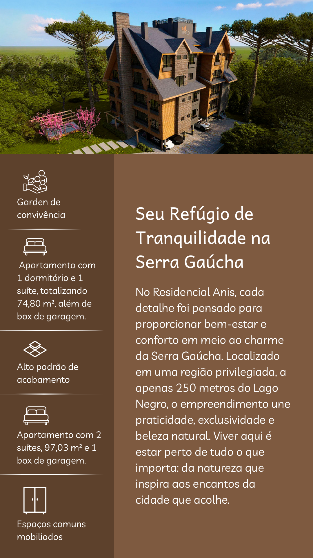 Entre o verde, o ar puro e a tranquilidade da Serra Gaúcha, o Residencial Anis oferece o privilégio de viver em um endereço que une natureza e conveniência.
